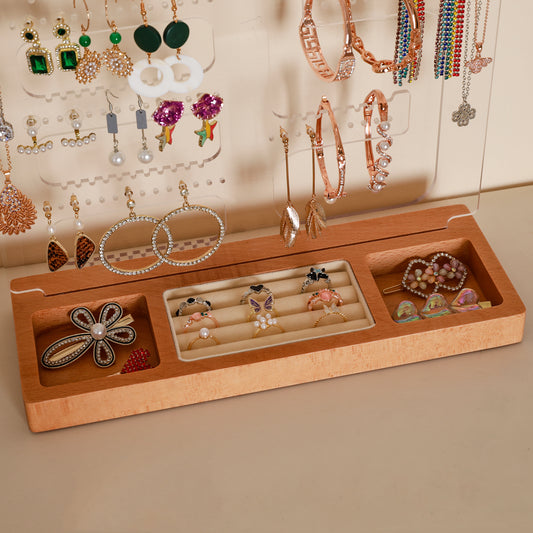 TIOPGHAD 114 Holes Jewelry Display Holder Stand, Earring Acrylic Organizer with Wooden Tray Necklace Tree Towers Rack Ring Holder for Jewellery Stud Earrings Bracelets Rings(Natural wood)