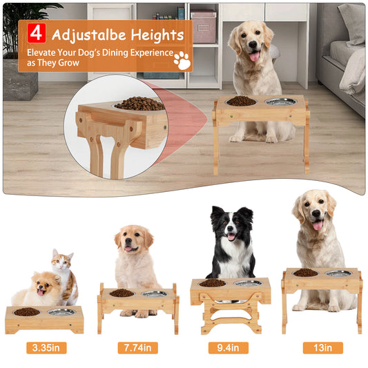 TIOPGHAD Elevated Dog Bowls 4 Height Adjustable Raised, Bamboo Dog Bowl Stand Feeder Set with 2 Food Water Bowls Feeding Station Stainless Steel Pet Dish with Stand for Small Medium Large Dogs Catsβ¦