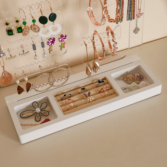 TIOPGHAD 114 Holes Jewelry Display Holder Stand, Earring Acrylic Organizer with Wooden Tray Necklace Tree Towers Rack Ring Holder for Jewellery Stud Earrings Bracelets Rings(White)
