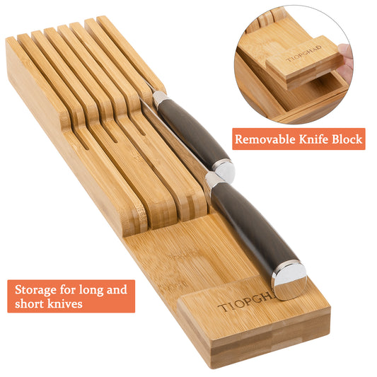TIOPGHAD Bamboo-Silverware-Drawer-Organizer-Kitchen, Expandable Utensil Holder Cutlery Tray Flatware Organization Adjustable Wood Tableware Dividers Storage (with Removable Knife Block)